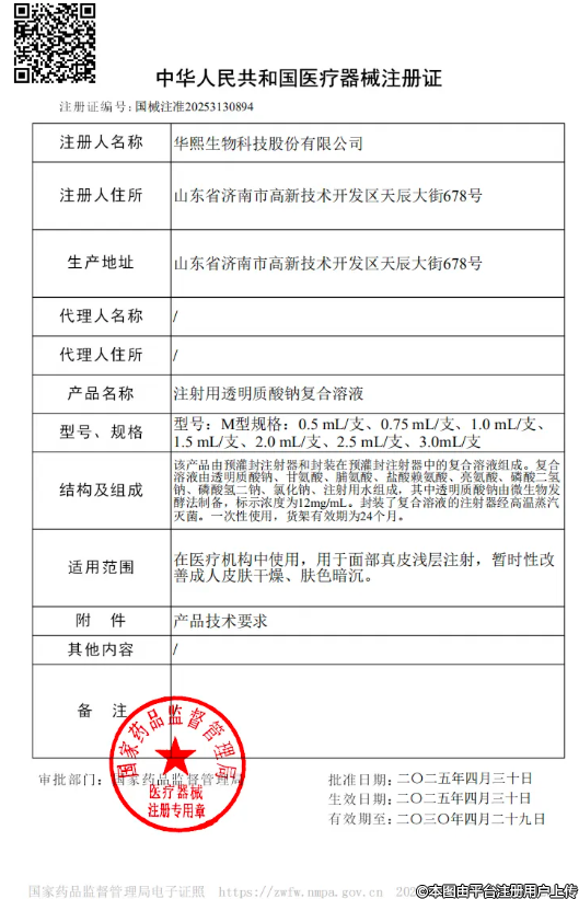 近日,繼"潤百顏·玻玻"Ⅲ類醫(yī)療器械注冊證獲批后僅一周,華熙生物再傳捷報,其自主研發(fā)的“注射用透明質酸鈉復合溶液-M型”(商品名:潤致·緹透)正式斬獲由NMPA頒發(fā)的Ⅲ類醫(yī)療器械注冊證,注冊證號為國械注準20253130894。