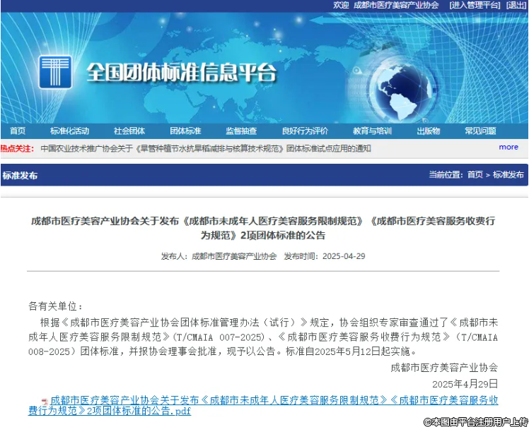 5月8日,成都市醫(yī)療美容產(chǎn)業(yè)協(xié)會正式發(fā)布《成都市醫(yī)療美容服務(wù)收費行為規(guī)范》《成都市未成年人醫(yī)療美容服務(wù)限制規(guī)范》兩項團體標(biāo)準(zhǔn),這是繼2024年“醫(yī)美之都?”成都標(biāo)準(zhǔn)體系建設(shè)后的又一里程碑,標(biāo)志著成都醫(yī)美產(chǎn)業(yè)向 “標(biāo)準(zhǔn)化、品質(zhì)化、國際化”邁進新高度!