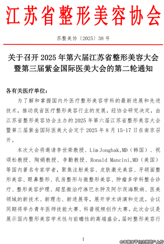關(guān)于召開2025年第六屆江蘇省整形美容大會暨第三屆紫金國際醫(yī)美大會的第二輪通知