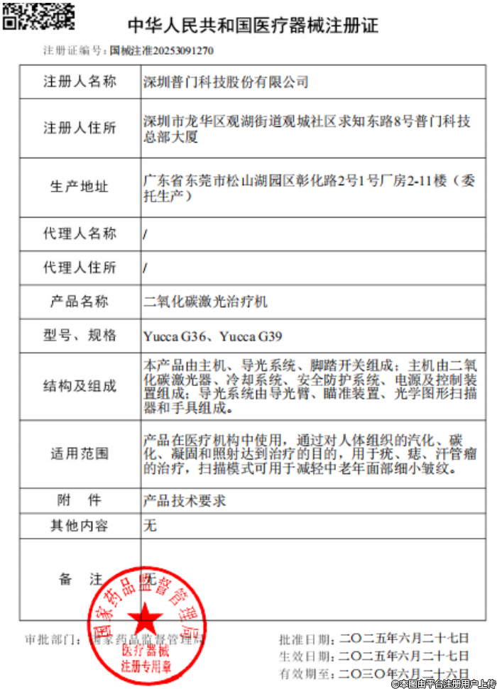 近日,普門科技旗下Ⅲ類醫(yī)療器械「二氧化碳激光治療機(jī)」正式獲得國(guó)家藥監(jiān)局批準(zhǔn)上市,國(guó)械注準(zhǔn)為20253091270,獲批適應(yīng)癥為“在醫(yī)療機(jī)構(gòu)中使用,通過對(duì)人體組織的汽化、碳化、凝固和照射達(dá)到治療的目的,用于疣、痣、汗管瘤的治療,掃描模式可用于減輕中老年面部細(xì)小皺紋。”