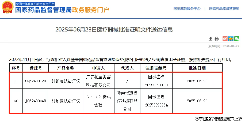 近日,國(guó)家藥品監(jiān)督管理局(NMPA)發(fā)布最新醫(yī)療器械批準(zhǔn)信息,兩款射頻皮膚治療儀正式獲批Ⅲ類醫(yī)療器械認(rèn)證,標(biāo)志著中國(guó)醫(yī)美器械領(lǐng)域再迎技術(shù)突破。此次獲批的產(chǎn)品分別來自廣東花至美容科技有限公司和ャ一マン株式會(huì)社(海南倍捷醫(yī)療科技有限公司代理),將進(jìn)一步豐富國(guó)內(nèi)合規(guī)醫(yī)美器械市場(chǎng)選擇,推動(dòng)行業(yè)規(guī)范化發(fā)展。