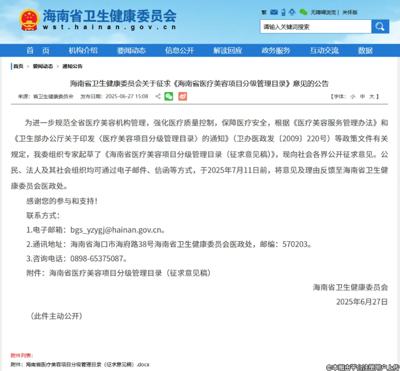 意見稿全文,可查看通知附件“海南省醫(yī)療美容項目分級管理目錄(征求意見稿).docx”。