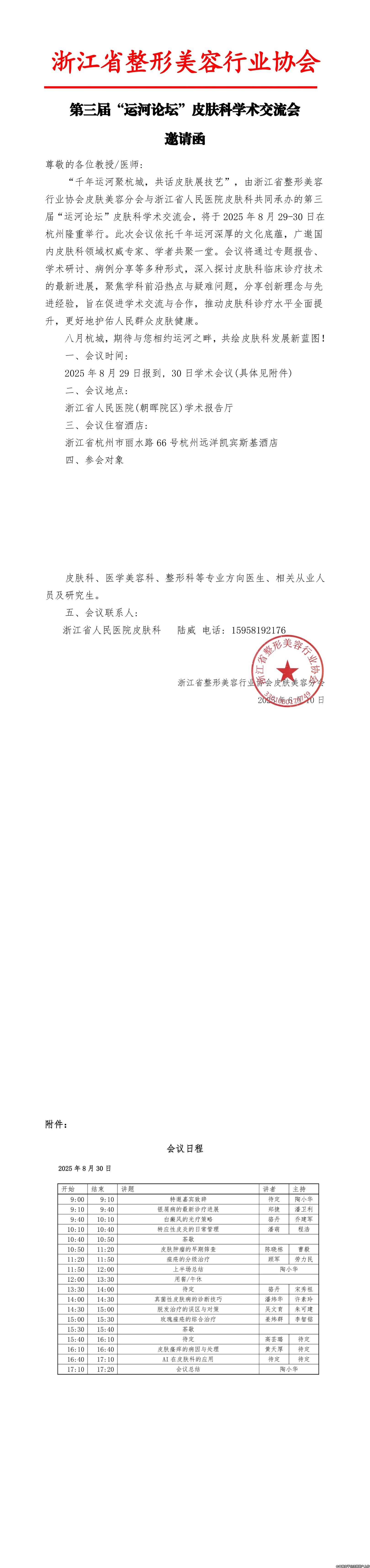 “千年運(yùn)河聚杭城,共話皮膚展技藝”由浙江省整形美容行業(yè)協(xié)會(huì)皮膚美容分會(huì)與浙江省人民醫(yī)院皮膚科共同承辦的第三屆“運(yùn)河論壇”皮膚科學(xué)術(shù)交流會(huì),將于2025年8月29-30日在杭州隆重舉行。此次會(huì)議依托千年運(yùn)河深厚的文化底蘊(yùn),廣邀國內(nèi)皮膚科領(lǐng)域權(quán)威專家、學(xué)者共聚一堂。會(huì)議將通過專題報(bào)告學(xué)術(shù)研討、病例分享等多種形式,深入探討皮膚科臨床診療技術(shù)的最新進(jìn)展,聚焦學(xué)科前沿?zé)狳c(diǎn)與疑難問題,分享創(chuàng)新理念與先進(jìn)經(jīng)驗(yàn),旨在促進(jìn)學(xué)術(shù)交流與合作,推動(dòng)皮膚科診療水平全面提升,更好地護(hù)佑人民群眾皮膚健康。