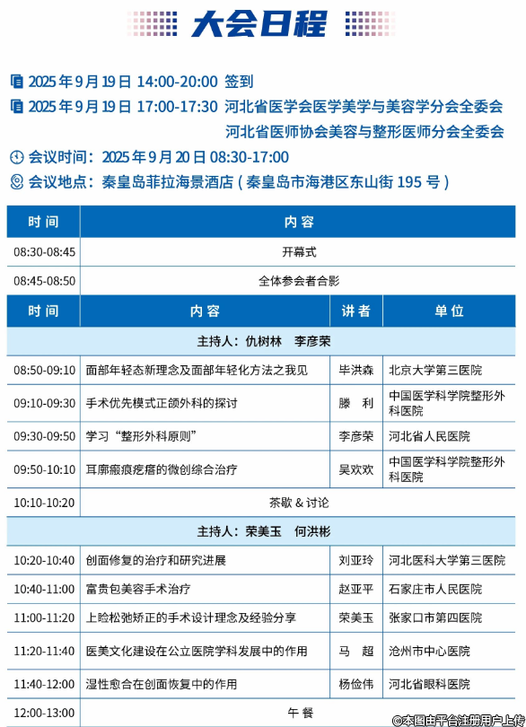 由河北省醫(yī)學(xué)會醫(yī)學(xué)美學(xué)與美容學(xué)分會、河北省醫(yī)師協(xié)會美容與整形醫(yī)師分會共同主辦,秦皇島市第一醫(yī)院承辦的“2025年河北省醫(yī)學(xué)會醫(yī)學(xué)美學(xué)與美容學(xué)分會年會暨河北省醫(yī)師協(xié)會美容與整形醫(yī)師分會年會、秦皇島市醫(yī)學(xué)會醫(yī)學(xué)美學(xué)與美容學(xué)專業(yè)委員會年會”定于2025年9月19日-21日在秦皇島市隆重召開。