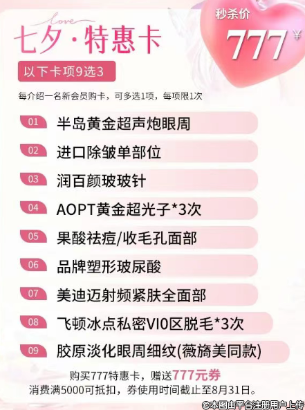 摯愛獻(xiàn)禮 寵愛限定禮遇,福州美貝爾整形七夕777特惠卡,9選3。老帶新加贈(zèng)1項(xiàng),多帶多贈(zèng)。777元消費(fèi)抵用超值券,數(shù)量有限,抓緊搶。