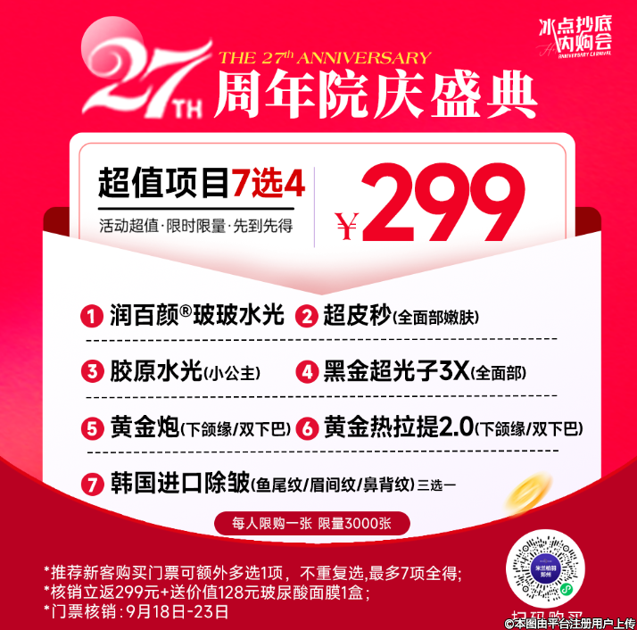 米蘭柏羽集美27周年慶重磅來襲,【冰點抄底內(nèi)購會】,0元卡感恩巨獻,299元任選四項價值千元爆款項目,轉(zhuǎn)介可多選,核銷立返299元,等于爆款項目免費送。