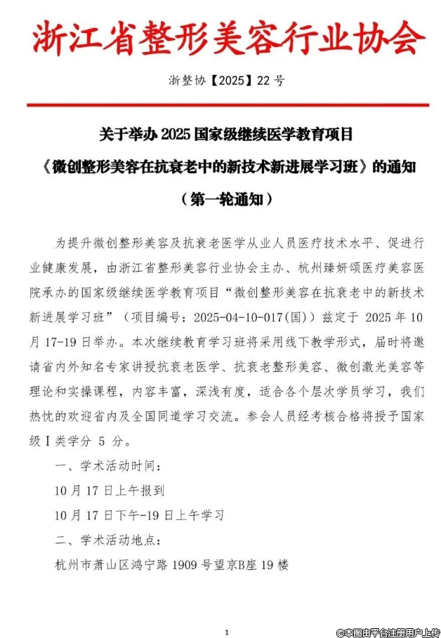 為提升微創(chuàng)整形美容及抗衰老醫(yī)學(xué)從業(yè)人員醫(yī)療技術(shù)水平、促進(jìn)行業(yè)健康發(fā)展,由浙江省整形美容行業(yè)協(xié)會(huì)主辦、杭州臻妍頌醫(yī)療美容醫(yī)院承辦的國(guó)家級(jí)繼續(xù)醫(yī)學(xué)教育項(xiàng)目“微創(chuàng)整形美容在抗衰老中的新技術(shù)新進(jìn)展學(xué)習(xí)班”(項(xiàng)目編號(hào):2025-04-10-017(國(guó)))茲定于2025年10月17-19日舉辦。本次繼續(xù)教育學(xué)習(xí)班將采用線下教學(xué)形式,屆時(shí)將邀請(qǐng)省內(nèi)外知名專家講授抗衰老醫(yī)學(xué)、抗衰老整形美容、微創(chuàng)激光美容等理論和實(shí)操課程,內(nèi)容豐富,深淺有度,適合各個(gè)層次學(xué)員學(xué)習(xí),我們熱忱的歡迎省內(nèi)及全國(guó)同道學(xué)習(xí)交流。參會(huì)人員經(jīng)考核合格將授予國(guó)家級(jí)I類學(xué)分 5分。