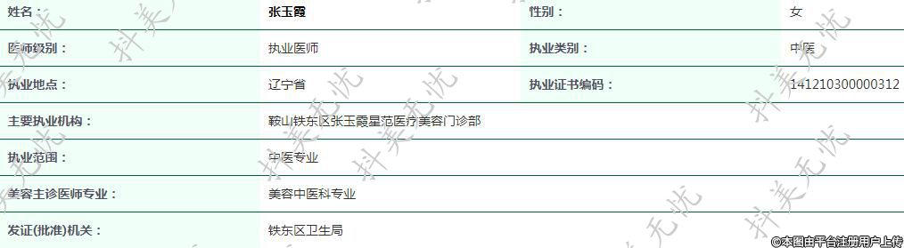 主要執(zhí)業(yè)機構:鞍山鐵東區(qū)張玉霞星范醫(yī)療美容門診部