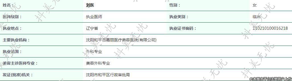 主要執(zhí)業(yè)機(jī)構(gòu):沈陽和平百嘉麗醫(yī)療美容醫(yī)院(有限公司)