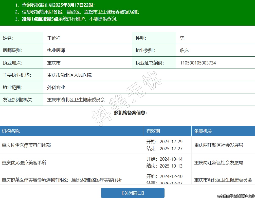機構名稱 有效期 備案機關 重慶佐伊醫(yī)療美容門診部 開始:2023-12-29結束:2025-12-27重慶兩江新區(qū)社會發(fā)展局 重慶優(yōu)尤醫(yī)療美容診所 開始:2024-10-14結束:2025-10-13重慶兩江新區(qū)社會發(fā)展局 重慶悅萊醫(yī)療美容診所連鎖有限公司渝北和雅路醫(yī)療美容診所 開始:2024-12-10結束:2026-12-07重慶市渝北區(qū)衛(wèi)生健康委員會 重慶美麗部落渝美醫(yī)療美容門診部 開始:2025-07-21結束:2027-07-18重慶市渝北區(qū)衛(wèi)生健康委員會 -