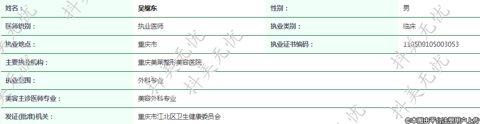 主要執(zhí)業(yè)機(jī)構(gòu):重慶美萊整形美容醫(yī)院