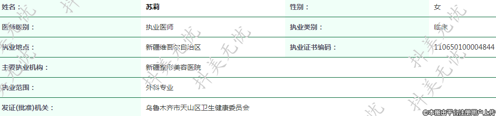 醫(yī)師執(zhí)業(yè)編碼:110650100004844,畢業(yè)于新疆石河子大學臨床醫(yī)學系。