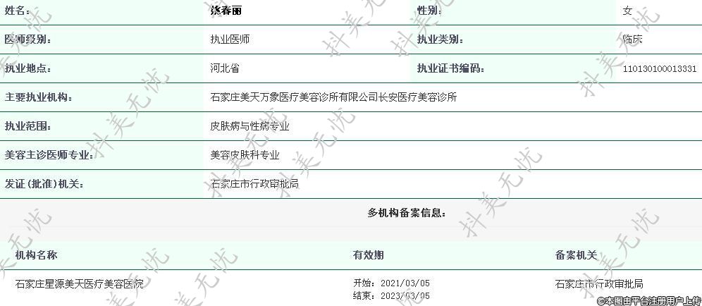 主要執(zhí)業(yè)機(jī)構(gòu):石家莊美天萬(wàn)象醫(yī)療美容診所有限公司長(zhǎng)安醫(yī)療美容診所