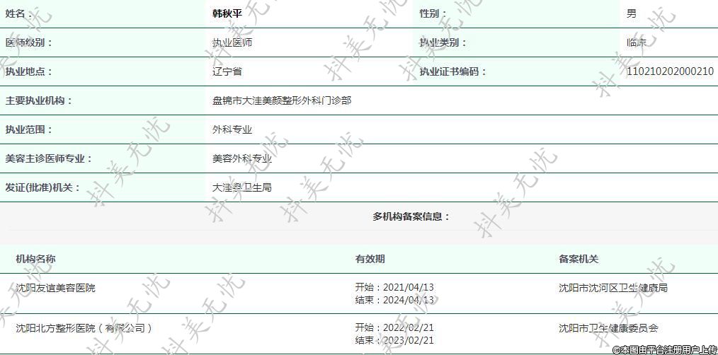 主要執(zhí)業(yè)機(jī)構(gòu):盤(pán)錦市大洼美顏整形外科門(mén)診部
