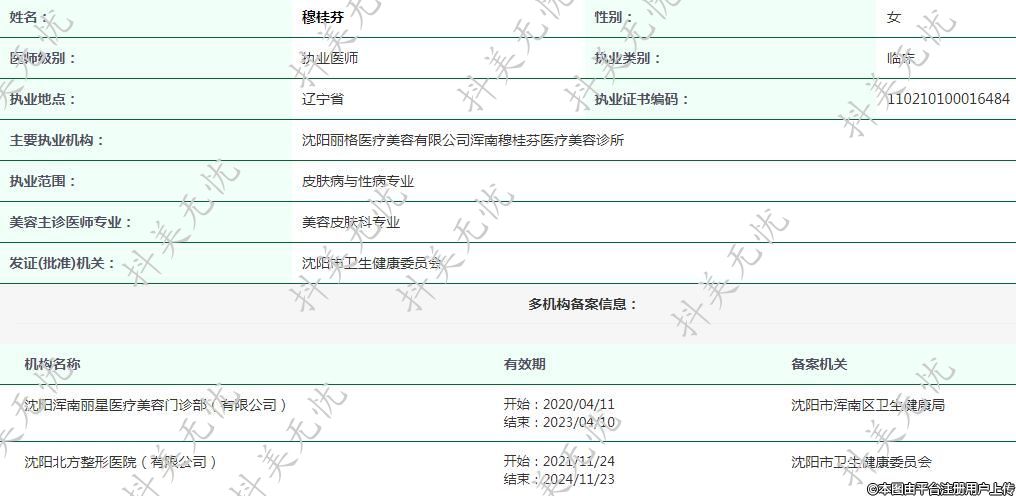 主要執(zhí)業(yè)機(jī)構(gòu):沈陽麗格醫(yī)療美容有限公司渾南穆桂芬醫(yī)療美容診所
