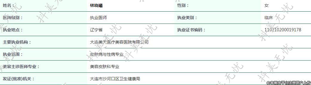主要執(zhí)業(yè)機構(gòu):大連美天醫(yī)療美容醫(yī)院有限公司