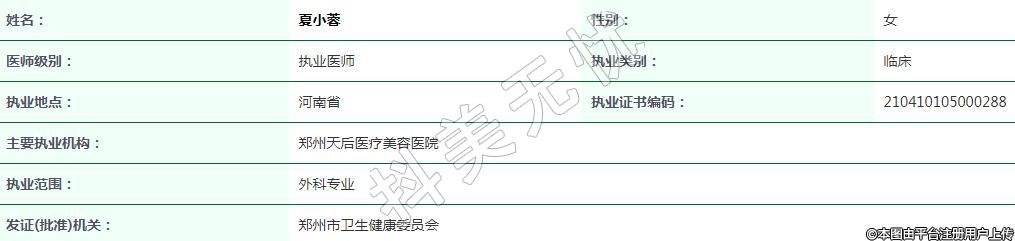 主要執(zhí)業(yè)機(jī)構(gòu):鄭州天后醫(yī)療美容醫(yī)院