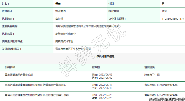 主要執(zhí)業(yè)機(jī)構(gòu):青島諾美德健康管理有限公司市南諾美德醫(yī)療美容門診部