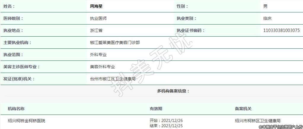 主要執(zhí)業(yè)機(jī)構(gòu):椒江愛萊美醫(yī)療美容門診部
