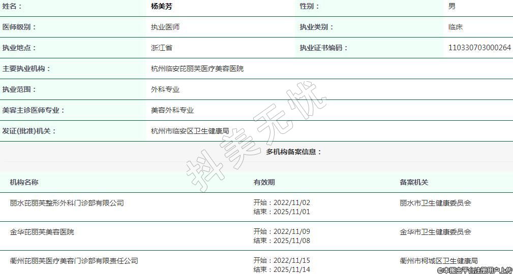 主要執(zhí)業(yè)機(jī)構(gòu):杭州臨安芘麗芙醫(yī)療美容醫(yī)院