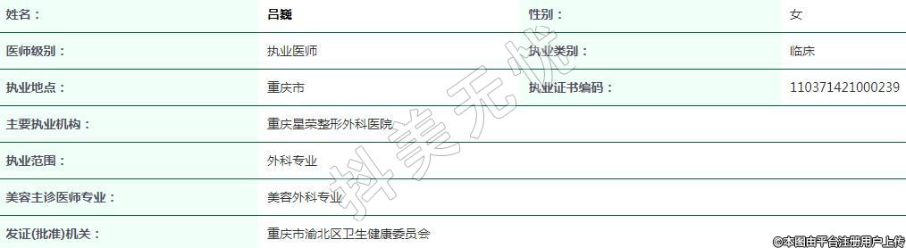 現(xiàn)任職于重慶星榮醫(yī)療美容執(zhí)業(yè)醫(yī)師 -