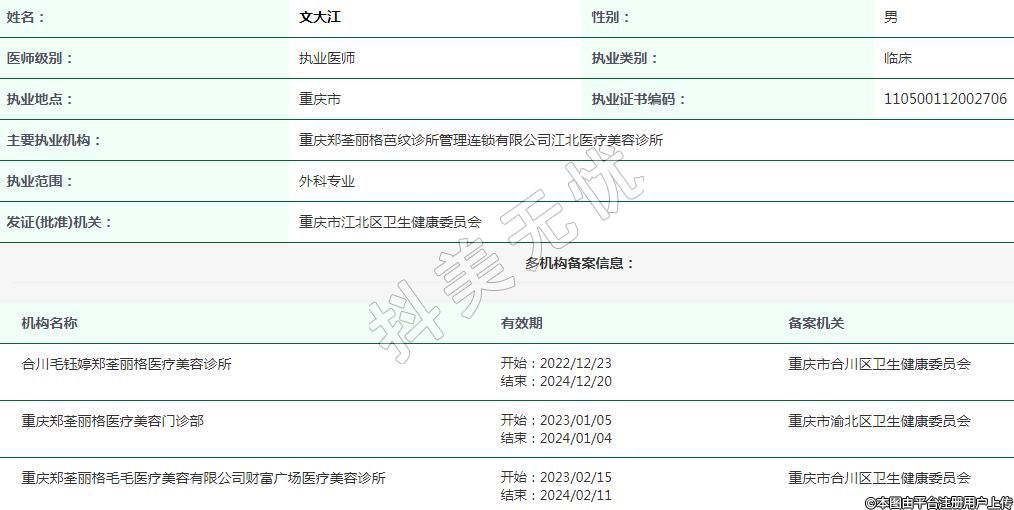 主要執(zhí)業(yè)機構(gòu):重慶鄭荃麗格芭紋診所管理連鎖有限公司江北醫(yī)療美容診所