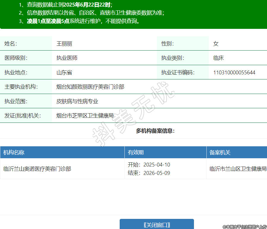 姓名:王麗麗性別:女醫(yī)師級(jí)別:執(zhí)業(yè)醫(yī)師執(zhí)業(yè)類(lèi)別:臨床執(zhí)業(yè)地點(diǎn):山東省執(zhí)業(yè)證書(shū)編碼:110310000055644主要執(zhí)業(yè)機(jī)構(gòu):煙臺(tái)知顏致麗醫(yī)療美容門(mén)診部執(zhí)業(yè)范圍:皮膚病與性病專(zhuān)業(yè)發(fā)證(批準(zhǔn))機(jī)關(guān):煙臺(tái)市芝罘區(qū)衛(wèi)生健康局多機(jī)構(gòu)備案信息:機(jī)構(gòu)名稱 有效期 備案機(jī)關(guān) 臨沂蘭山奧諾醫(yī)療美容門(mén)診部 開(kāi)始:2025-04-10結(jié)束:2026-05-09臨沂市蘭山區(qū)衛(wèi)生健康局 -