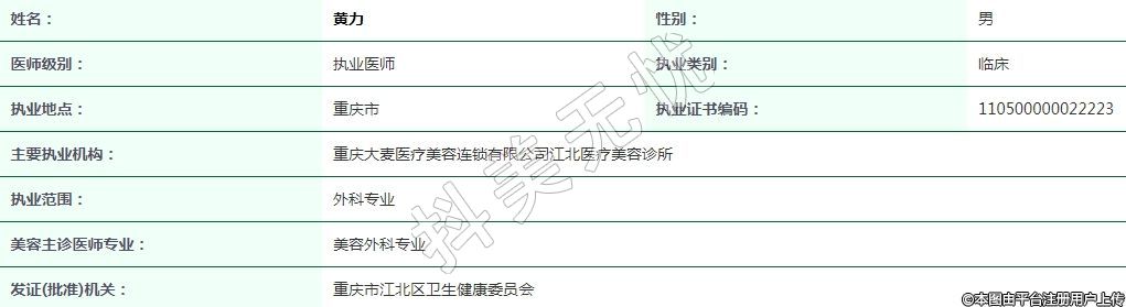 主要執(zhí)業(yè)機構(gòu):重慶大麥醫(yī)療美容連鎖有限公司江北醫(yī)療美容診所
