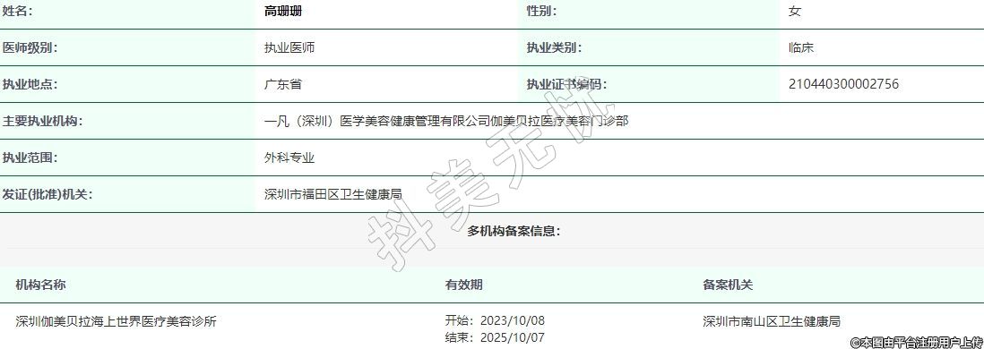 主要執(zhí)業(yè)機(jī)構(gòu):一凡(深圳)醫(yī)學(xué)美容健康管理有限公司伽美貝拉醫(yī)療美容門診部