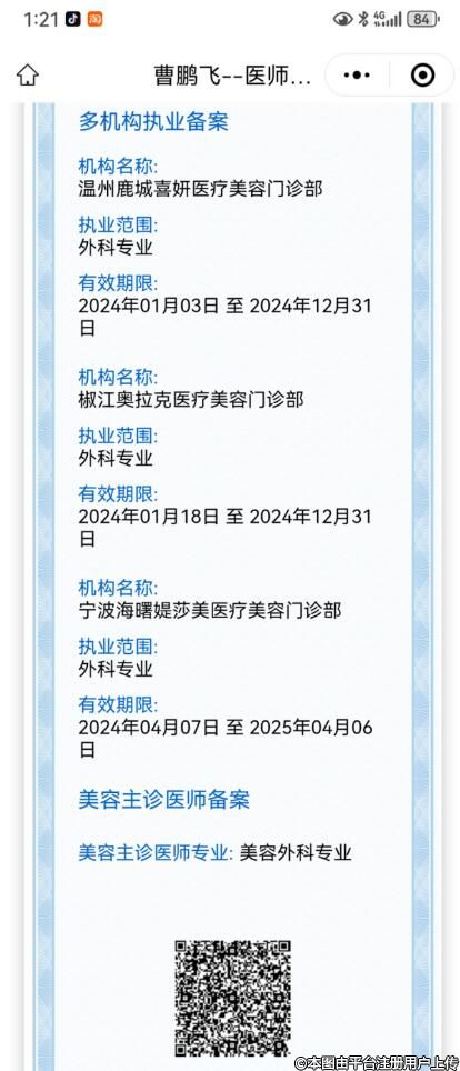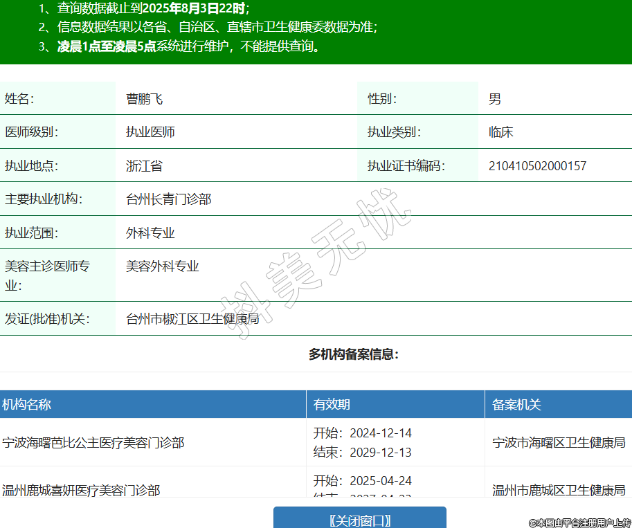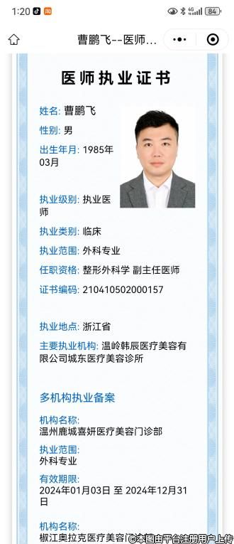 姓名:曹鵬飛性別:男醫(yī)師級(jí)別:執(zhí)業(yè)醫(yī)師執(zhí)業(yè)類別:臨床執(zhí)業(yè)地點(diǎn):浙江省執(zhí)業(yè)證書編碼:210410502000157主要執(zhí)業(yè)機(jī)構(gòu):臺(tái)州長青門診部執(zhí)業(yè)范圍:外科專業(yè)美容主診醫(yī)師專業(yè):美容外科專業(yè)發(fā)證(批準(zhǔn))機(jī)關(guān):臺(tái)州市椒江區(qū)衛(wèi)生健康局多機(jī)構(gòu)備案信息:機(jī)構(gòu)名稱 有效期 備案機(jī)關(guān) 寧波海曙芭比公主醫(yī)療美容門診部 開始:2024-12-14結(jié)束:2029-12-13寧波市海曙區(qū)衛(wèi)生健康局 溫州鹿城喜妍醫(yī)療美容門診部 開始:2025-04-24結(jié)束:2027-04-23溫州市鹿城區(qū)衛(wèi)生健康局 溫州甌海星耀美辰整形外科門診部 開始:2025-05-10結(jié)束:2027-05-08溫州市甌海區(qū)衛(wèi)生健康局 椒江華錦醫(yī)療美容門診部 開始:2025-07-09結(jié)束:2027-07-08臺(tái)州市椒江區(qū)衛(wèi)生健康局 溫州鹿城芭媞芭媞醫(yī)療美容診所 開始:2025-07-31結(jié)束:2026-07-30溫州市鹿城區(qū)衛(wèi)生健康局 -