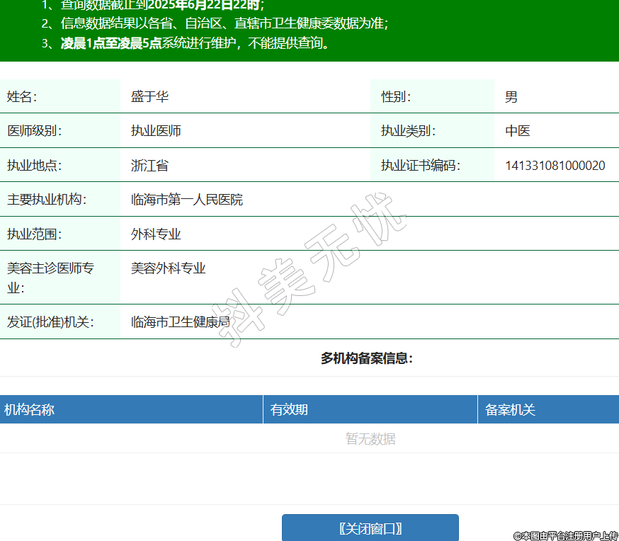 姓名:盛于華性別:男醫(yī)師級別:執(zhí)業(yè)醫(yī)師執(zhí)業(yè)類別:中醫(yī)執(zhí)業(yè)地點:浙江省執(zhí)業(yè)證書編碼:141331081000020主要執(zhí)業(yè)機構:臨海市第一人民醫(yī)院執(zhí)業(yè)范圍:外科專業(yè)美容主診醫(yī)師專業(yè):美容外科專業(yè)發(fā)證(批準)機關:臨海市衛(wèi)生健康局 -