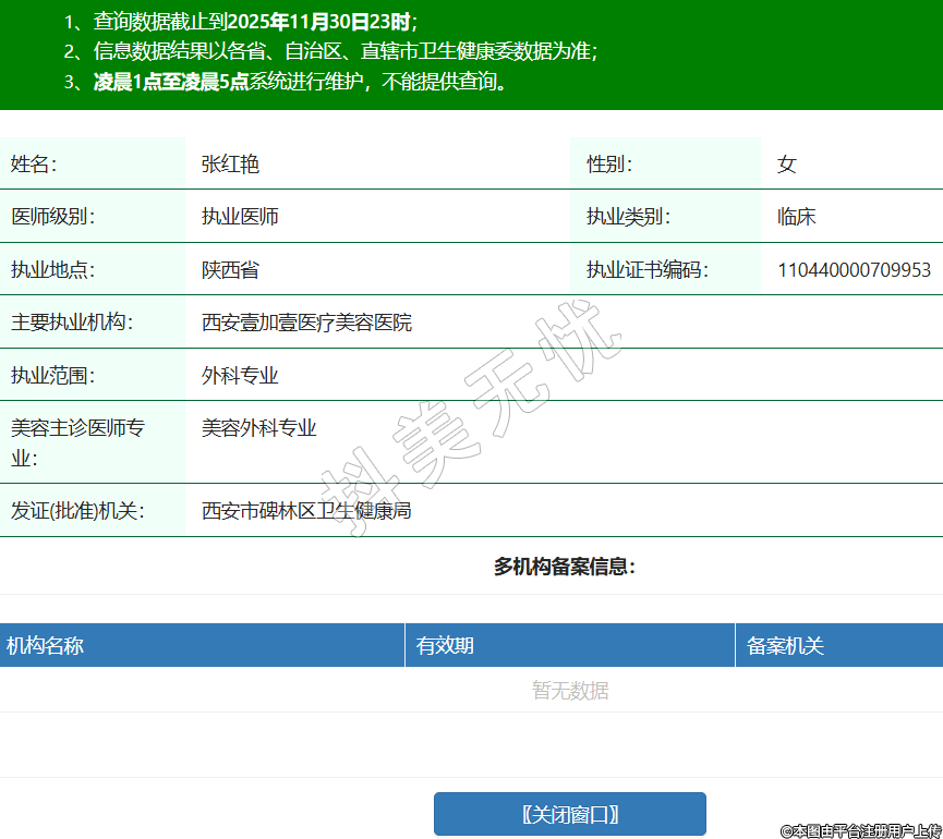 姓名:張紅艷性別:女醫(yī)師級(jí)別:執(zhí)業(yè)醫(yī)師執(zhí)業(yè)類(lèi)別:臨床執(zhí)業(yè)地點(diǎn):陜西省執(zhí)業(yè)證書(shū)編碼:110440000709953主要執(zhí)業(yè)機(jī)構(gòu):西安壹加壹醫(yī)療美容醫(yī)院執(zhí)業(yè)范圍:外科專(zhuān)業(yè)美容主診醫(yī)師專(zhuān)業(yè):美容外科專(zhuān)業(yè)發(fā)證(批準(zhǔn))機(jī)關(guān):西安市碑林區(qū)衛(wèi)生健康局 -