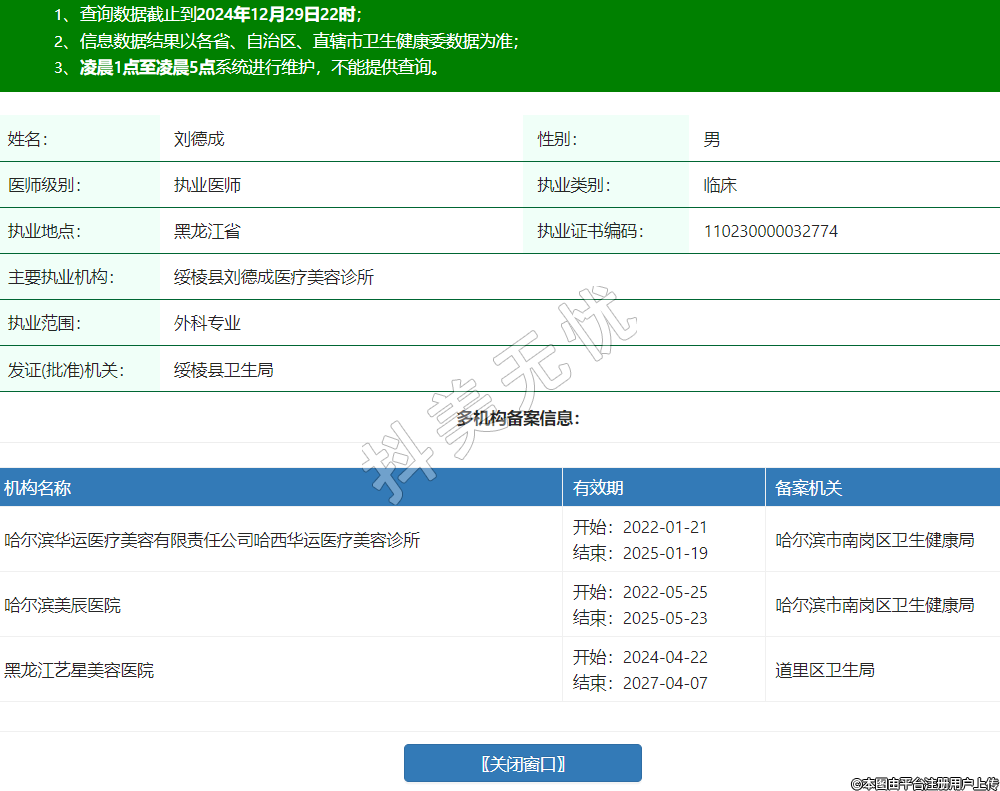 機構(gòu)名稱:哈爾濱華運醫(yī)療美容有限責任公司哈西華運醫(yī)療美容診所有效期: