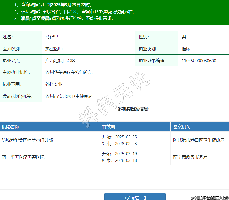 主要執(zhí)業(yè)機(jī)構(gòu):欽州華美醫(yī)療美容門(mén)診部