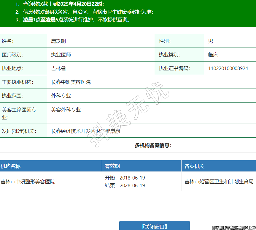 姓名:龐玖明性別:男醫(yī)師級別:執(zhí)業(yè)醫(yī)師執(zhí)業(yè)類別:臨床執(zhí)業(yè)地點:吉林省執(zhí)業(yè)證書編碼:110220100008924主要執(zhí)業(yè)機構:長春中妍美容醫(yī)院執(zhí)業(yè)范圍:外科專業(yè)美容主診醫(yī)師專業(yè):美容外科專業(yè)發(fā)證(批準)機關:長春經濟技術開發(fā)區(qū)衛(wèi)生健康局多機構備案信息:機構名稱 有效期 備案機關 吉林市中妍整形美容醫(yī)院 開始:2018-06-19結束:2028-06-19吉林市船營區(qū)衛(wèi)生和計劃生育局 -