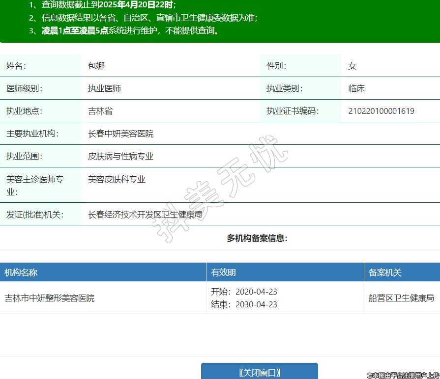姓名:包娜性別:女醫(yī)師級別:執(zhí)業(yè)醫(yī)師執(zhí)業(yè)類別:臨床執(zhí)業(yè)地點:吉林省執(zhí)業(yè)證書編碼:210220100001619主要執(zhí)業(yè)機構(gòu):長春中妍美容醫(yī)院執(zhí)業(yè)范圍:皮膚病與性病專業(yè)美容主診醫(yī)師專業(yè):美容皮膚科專業(yè)發(fā)證(批準)機關(guān):長春經(jīng)濟技術(shù)開發(fā)區(qū)衛(wèi)生健康局多機構(gòu)備案信息:機構(gòu)名稱 有效期 備案機關(guān) 吉林市中妍整形美容醫(yī)院 開始:2020-04-23結(jié)束:2030-04-23船營區(qū)衛(wèi)生健康局 -