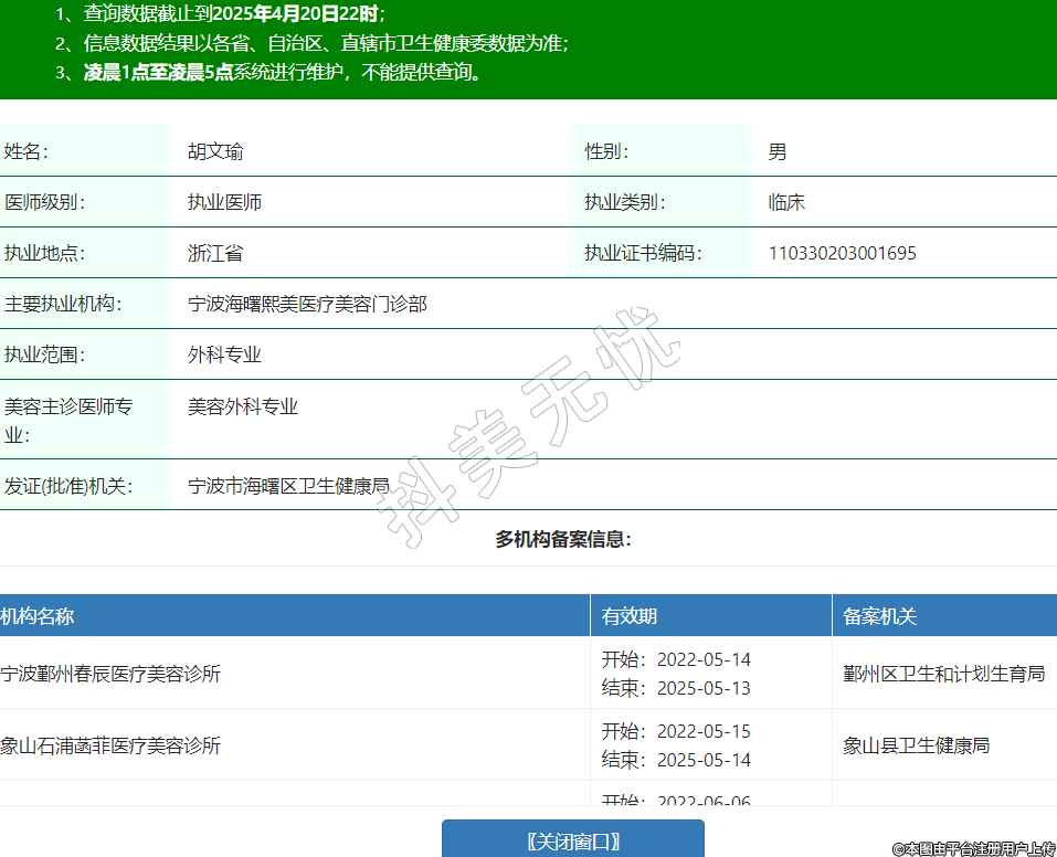 姓名:胡文瑜性別:男醫(yī)師級(jí)別:執(zhí)業(yè)醫(yī)師執(zhí)業(yè)類別:臨床執(zhí)業(yè)地點(diǎn):浙江省執(zhí)業(yè)證書編碼:110330203001695主要執(zhí)業(yè)機(jī)構(gòu):寧波海曙熙美醫(yī)療美容門診部執(zhí)業(yè)范圍:外科專業(yè)美容主診醫(yī)師專業(yè):美容外科專業(yè)發(fā)證(批準(zhǔn))機(jī)關(guān):寧波市海曙區(qū)衛(wèi)生健康局多機(jī)構(gòu)備案信息:機(jī)構(gòu)名稱 有效期 備案機(jī)關(guān) 寧波鄞州春辰醫(yī)療美容診所 開始:2022-05-14結(jié)束:2025-05-13鄞州區(qū)衛(wèi)生和計(jì)劃生育局 象山石浦菡菲醫(yī)療美容診所 開始:2022-05-15結(jié)束:2025-05-14象山縣衛(wèi)生健康局 衢州市柯城區(qū)桂美人醫(yī)療美容門診部(普通合伙) 開始:2022-06-06結(jié)束:2027-06-05衢州市柯城區(qū)衛(wèi)生健康局 寧波江北尚麗醫(yī)療美容門診部 開始:2023-08-31結(jié)束:2026-08-31寧波市江北區(qū)衛(wèi)生健康局 桐廬韓加醫(yī)療美容門診部 開始:2024-03-06結(jié)束:2027-03-04桐廬縣衛(wèi)生健康局 寧波江北外灘纖姿醫(yī)療美容門診部 開始:2024-05-21結(jié)束:2027-06-20寧波市江北區(qū)衛(wèi)生健康局 嘉興畫美醫(yī)療美容診所 開始:2024-12-02結(jié)束:2027-12-01嘉興市南湖區(qū)衛(wèi)生健康局 寧波海曙初美星范醫(yī)療美容門診部 開始:2025-04-09結(jié)束:2028-04-08寧波市海曙區(qū)衛(wèi)生健康局 -