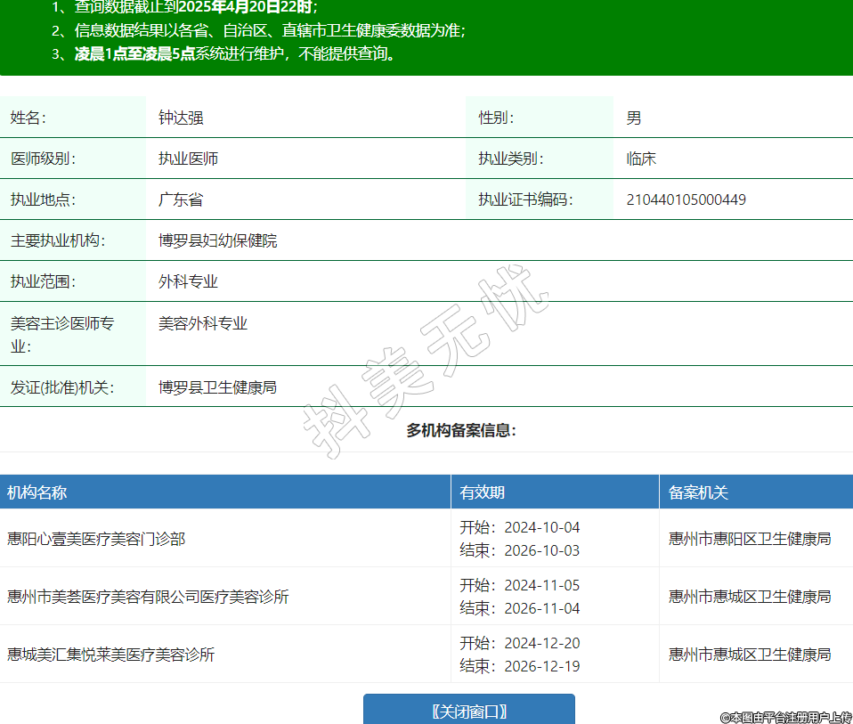 姓名:鐘達(dá)強(qiáng)性別:男醫(yī)師級(jí)別:執(zhí)業(yè)醫(yī)師執(zhí)業(yè)類別:臨床執(zhí)業(yè)地點(diǎn):廣東省執(zhí)業(yè)證書編碼:210440105000449主要執(zhí)業(yè)機(jī)構(gòu):博羅縣婦幼保健院執(zhí)業(yè)范圍:外科專業(yè)美容主診醫(yī)師專業(yè):美容外科專業(yè)發(fā)證(批準(zhǔn))機(jī)關(guān):博羅縣衛(wèi)生健康局多機(jī)構(gòu)備案信息:機(jī)構(gòu)名稱 有效期 備案機(jī)關(guān) 惠陽(yáng)心壹美醫(yī)療美容門診部 開始:2024-10-04結(jié)束:2026-10-03惠州市惠陽(yáng)區(qū)衛(wèi)生健康局 惠州市美薈醫(yī)療美容有限公司醫(yī)療美容診所 開始:2024-11-05結(jié)束:2026-11-04惠州市惠城區(qū)衛(wèi)生健康局 惠城美匯集悅?cè)R美醫(yī)療美容診所 開始:2024-12-20結(jié)束:2026-12-19惠州市惠城區(qū)衛(wèi)生健康局 -