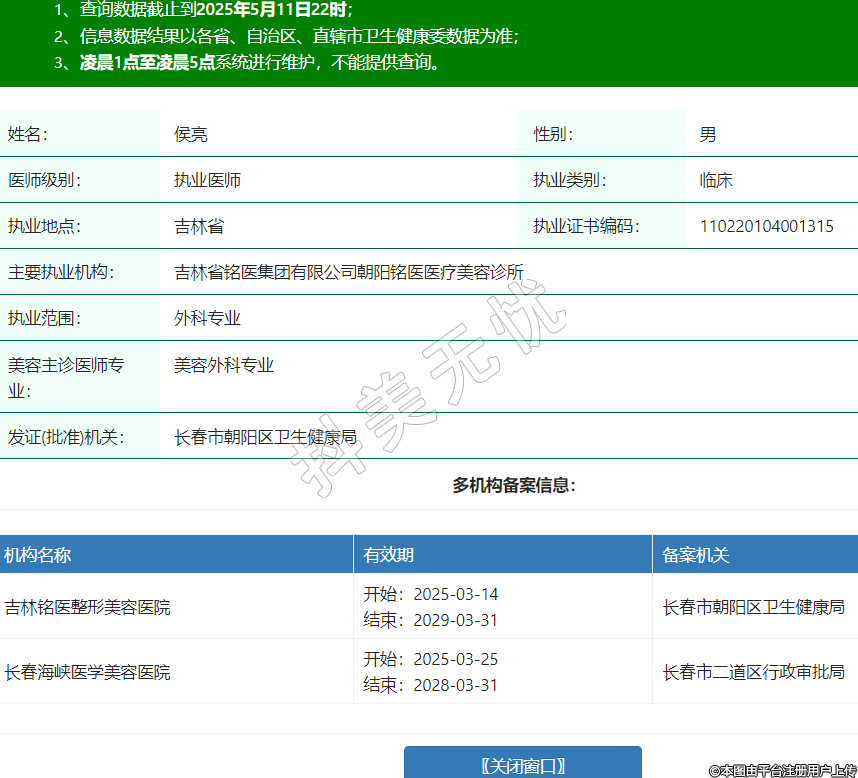 機(jī)構(gòu)名稱 有效期 備案機(jī)關(guān) 吉林銘醫(yī)整形美容醫(yī)院 開始:2025-03-14結(jié)束:2029-03-31長(zhǎng)春市朝陽區(qū)衛(wèi)生健康局 長(zhǎng)春海峽醫(yī)學(xué)美容醫(yī)院 開始:2025-03-25結(jié)束:2028-03-31長(zhǎng)春市二道區(qū)行政審批局 -