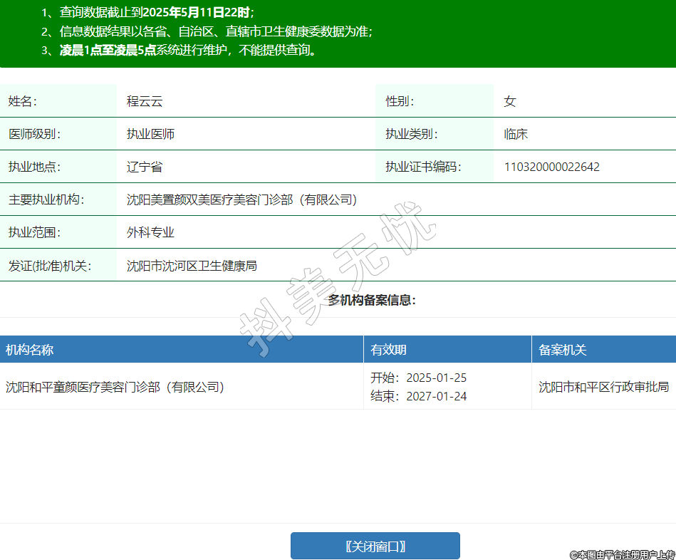 姓名:程云云性別:女醫(yī)師級(jí)別:執(zhí)業(yè)醫(yī)師執(zhí)業(yè)類別:臨床執(zhí)業(yè)地點(diǎn):遼寧省執(zhí)業(yè)證書編碼:110320000022642主要執(zhí)業(yè)機(jī)構(gòu):沈陽美置顏雙美醫(yī)療美容門診部(有限公司)執(zhí)業(yè)范圍:外科專業(yè)發(fā)證(批準(zhǔn))機(jī)關(guān):沈陽市沈河區(qū)衛(wèi)生健康局多機(jī)構(gòu)備案信息:機(jī)構(gòu)名稱 有效期 備案機(jī)關(guān) 沈陽和平童顏醫(yī)療美容門診部(有限公司) 開始:2025-01-25結(jié)束:2027-01-24沈陽市和平區(qū)行政審批局 -