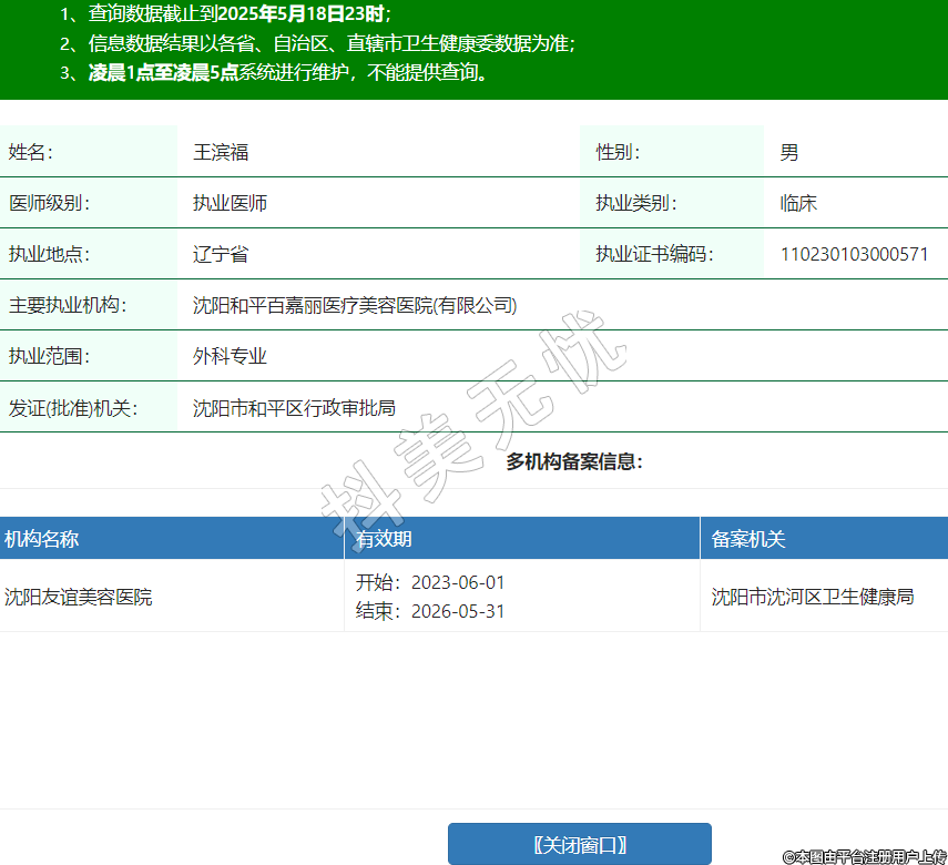 姓名:王濱福性別:男醫(yī)師級別:執(zhí)業(yè)醫(yī)師執(zhí)業(yè)類別:臨床執(zhí)業(yè)地點:遼寧省執(zhí)業(yè)證書編碼:110230103000571主要執(zhí)業(yè)機構(gòu):沈陽和平百嘉麗醫(yī)療美容醫(yī)院(有限公司)執(zhí)業(yè)范圍:外科專業(yè)發(fā)證(批準(zhǔn))機關(guān):沈陽市和平區(qū)行政審批局多機構(gòu)備案信息:機構(gòu)名稱 有效期 備案機關(guān) 沈陽友誼美容醫(yī)院 開始:2023-06-01結(jié)束:2026-05-31沈陽市沈河區(qū)衛(wèi)生健康局 -