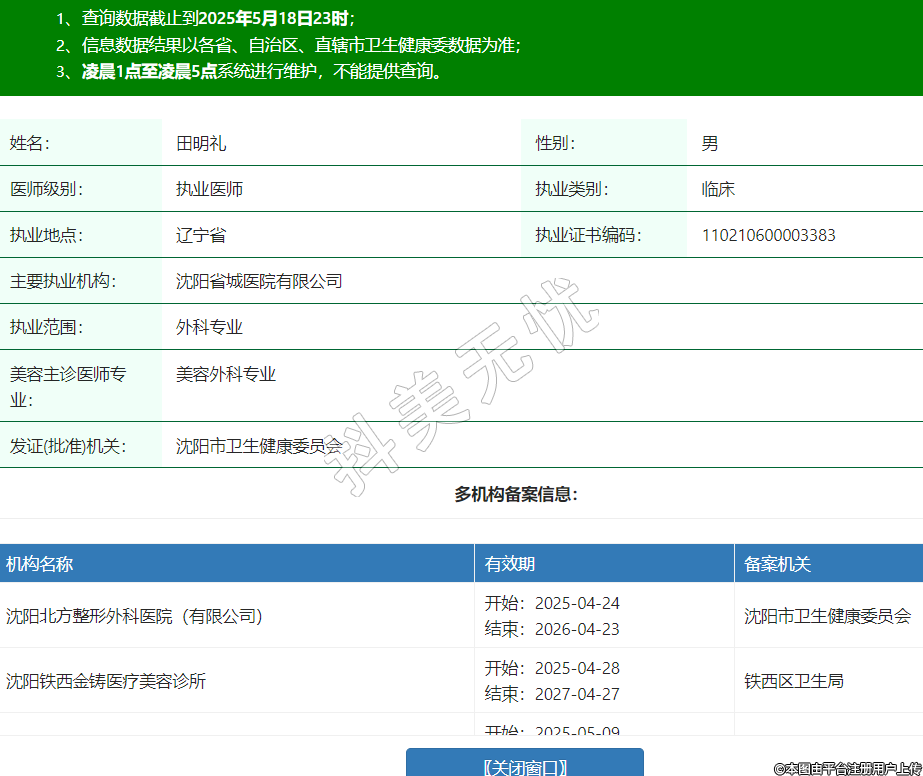 姓名:田明禮性別:男醫(yī)師級(jí)別:執(zhí)業(yè)醫(yī)師執(zhí)業(yè)類別:臨床執(zhí)業(yè)地點(diǎn):遼寧省執(zhí)業(yè)證書(shū)編碼:110210600003383主要執(zhí)業(yè)機(jī)構(gòu):沈陽(yáng)省城醫(yī)院有限公司執(zhí)業(yè)范圍:外科專業(yè)美容主診醫(yī)師專業(yè):美容外科專業(yè)發(fā)證(批準(zhǔn))機(jī)關(guān):沈陽(yáng)市衛(wèi)生健康委員會(huì)多機(jī)構(gòu)備案信息:機(jī)構(gòu)名稱 有效期 備案機(jī)關(guān) 沈陽(yáng)北方整形外科醫(yī)院(有限公司) 開(kāi)始:2025-04-24結(jié)束:2026-04-23沈陽(yáng)市衛(wèi)生健康委員會(huì) 沈陽(yáng)鐵西金鑄醫(yī)療美容診所 開(kāi)始:2025-04-28結(jié)束:2027-04-27鐵西區(qū)衛(wèi)生局 沈陽(yáng)保髖骨科醫(yī)院(有限公司) 開(kāi)始:2025-05-09結(jié)束:2028-05-08沈陽(yáng)市衛(wèi)生健康委員會(huì) 沈陽(yáng)維康醫(yī)院 開(kāi)始:2025-05-09結(jié)束:2028-05-08沈陽(yáng)市衛(wèi)生健康委員會(huì) -