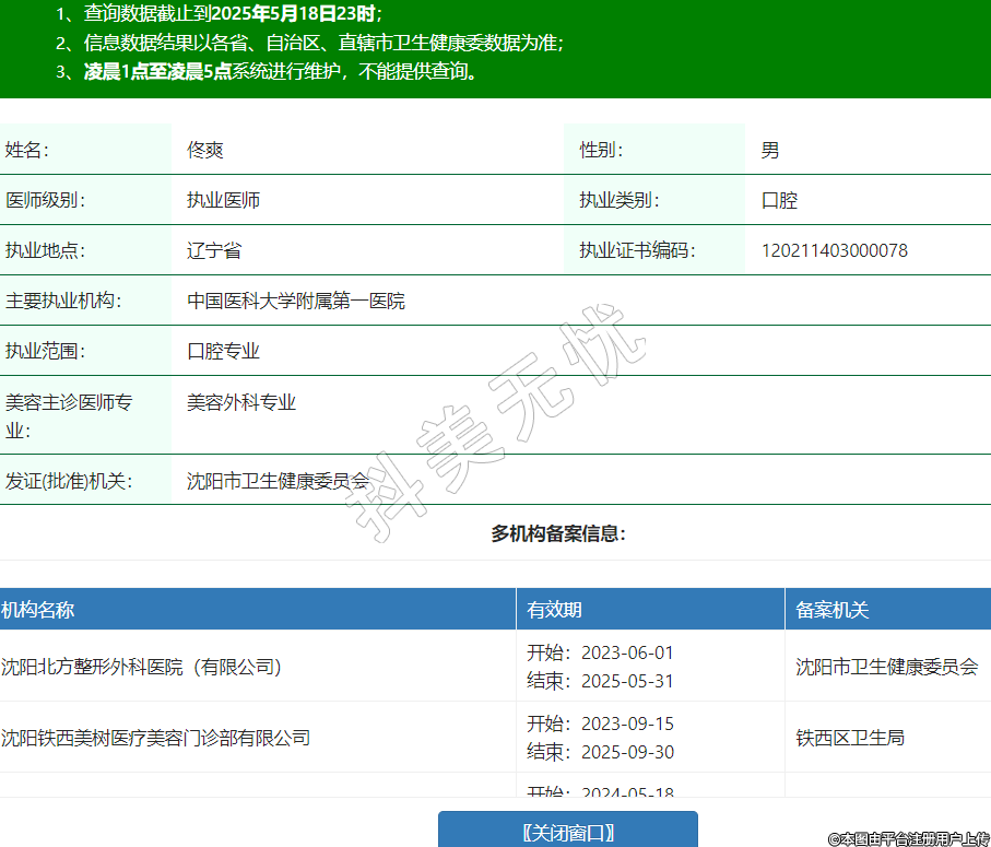 姓名:佟爽性別:男醫(yī)師級別:執(zhí)業(yè)醫(yī)師執(zhí)業(yè)類別:口腔執(zhí)業(yè)地點:遼寧省執(zhí)業(yè)證書編碼:120211403000078主要執(zhí)業(yè)機構(gòu):中國醫(yī)科大學(xué)附屬第一醫(yī)院執(zhí)業(yè)范圍:口腔專業(yè)美容主診醫(yī)師專業(yè):美容外科專業(yè)發(fā)證(批準(zhǔn))機關(guān):沈陽市衛(wèi)生健康委員會多機構(gòu)備案信息:機構(gòu)名稱 有效期 備案機關(guān) 沈陽北方整形外科醫(yī)院(有限公司) 開始:2023-06-01結(jié)束:2025-05-31沈陽市衛(wèi)生健康委員會 沈陽鐵西美樹醫(yī)療美容門診部有限公司 開始:2023-09-15結(jié)束:2025-09-30鐵西區(qū)衛(wèi)生局 沈陽京沈醫(yī)院 開始:2024-05-18結(jié)束:2027-05-17沈陽市衛(wèi)生健康委員會 沈陽和平嘉華口腔門診部有限公司 開始:2024-07-17結(jié)束:2026-07-31沈陽市和平區(qū)行政審批局 沈陽市第四人民醫(yī)院 開始:2024-11-11結(jié)束:2026-11-10沈陽市衛(wèi)生健康委員會 -