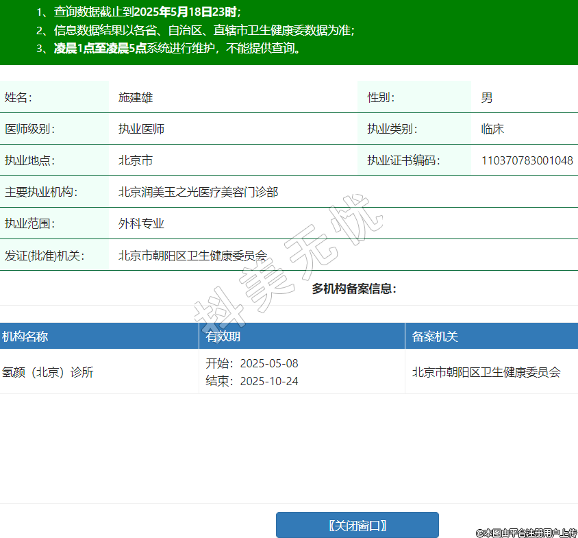 姓名:施建雄性別:男醫(yī)師級(jí)別:執(zhí)業(yè)醫(yī)師執(zhí)業(yè)類別:臨床執(zhí)業(yè)地點(diǎn):北京市執(zhí)業(yè)證書編碼:110370783001048主要執(zhí)業(yè)機(jī)構(gòu):北京潤美玉之光醫(yī)療美容門診部執(zhí)業(yè)范圍:外科專業(yè)發(fā)證(批準(zhǔn))機(jī)關(guān):北京市朝陽區(qū)衛(wèi)生健康委員會(huì)多機(jī)構(gòu)備案信息:機(jī)構(gòu)名稱 有效期 備案機(jī)關(guān) 氫顏(北京)診所 開始:2025-05-08結(jié)束:2025-10-24北京市朝陽區(qū)衛(wèi)生健康委員會(huì) -