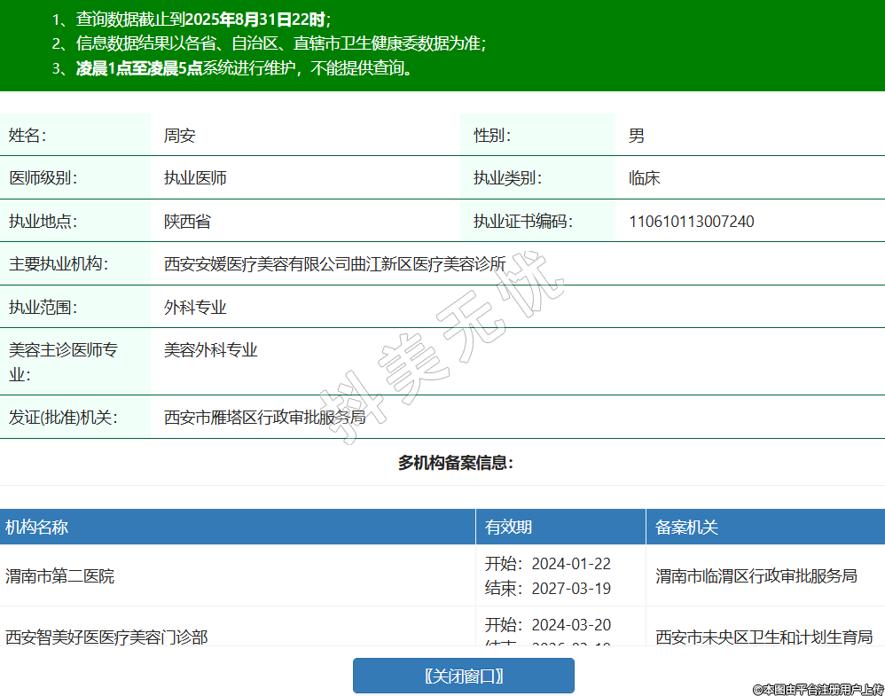 姓名:周安性別:男醫(yī)師級別:執(zhí)業(yè)醫(yī)師執(zhí)業(yè)類別:臨床執(zhí)業(yè)地點:陜西省執(zhí)業(yè)證書編碼:110610113007240主要執(zhí)業(yè)機構(gòu):西安安媛醫(yī)療美容有限公司曲江新區(qū)醫(yī)療美容診所執(zhí)業(yè)范圍:外科專業(yè)美容主診醫(yī)師專業(yè):美容外科專業(yè)發(fā)證(批準)機關:西安市雁塔區(qū)行政審批服務局多機構(gòu)備案信息:機構(gòu)名稱 有效期 備案機關 渭南市第二醫(yī)院 開始:2024-01-22結(jié)束:2027-03-19渭南市臨渭區(qū)行政審批服務局 西安智美好醫(yī)醫(yī)療美容門診部 開始:2024-03-20結(jié)束:2026-03-19西安市未央?yún)^(qū)衛(wèi)生和計劃生育局 西安星容妍醫(yī)療科技有限責任公司曲江新區(qū)醫(yī)療美容診所 開始:2024-11-21結(jié)束:2025-11-20西安市雁塔區(qū)行政審批服務局 -