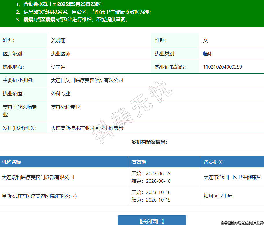 姓名:姜曉麗性別:女醫(yī)師級別:執(zhí)業(yè)醫(yī)師執(zhí)業(yè)類別:臨床執(zhí)業(yè)地點:遼寧省執(zhí)業(yè)證書編碼:110210204000259主要執(zhí)業(yè)機構:大連白又白醫(yī)療美容診所有限公司執(zhí)業(yè)范圍:外科專業(yè)美容主診醫(yī)師專業(yè):美容外科專業(yè)發(fā)證(批準)機關:大連高新技術產(chǎn)業(yè)園區(qū)衛(wèi)生健康局多機構備案信息:機構名稱 有效期 備案機關 大連瑞和醫(yī)療美容門診部有限公司 開始:2023-06-19結束:2026-06-18大連市沙河口區(qū)衛(wèi)生健康局 阜新安琪美醫(yī)療美容醫(yī)院(有限公司) 開始:2023-10-16結束:2026-10-15細河區(qū)衛(wèi)生局 -