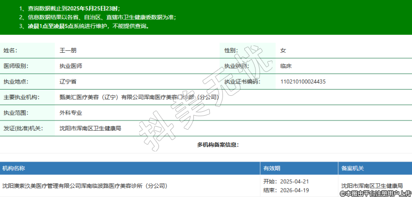 姓名:王一朋性別:女醫(yī)師級(jí)別:執(zhí)業(yè)醫(yī)師執(zhí)業(yè)類別:臨床執(zhí)業(yè)地點(diǎn):遼寧省執(zhí)業(yè)證書編碼:110210100024435主要執(zhí)業(yè)機(jī)構(gòu):甄美匯醫(yī)療美容(遼寧)有限公司渾南醫(yī)療美容門診部(分公司)執(zhí)業(yè)范圍:外科專業(yè)發(fā)證(批準(zhǔn))機(jī)關(guān):沈陽(yáng)市渾南區(qū)衛(wèi)生健康局 -