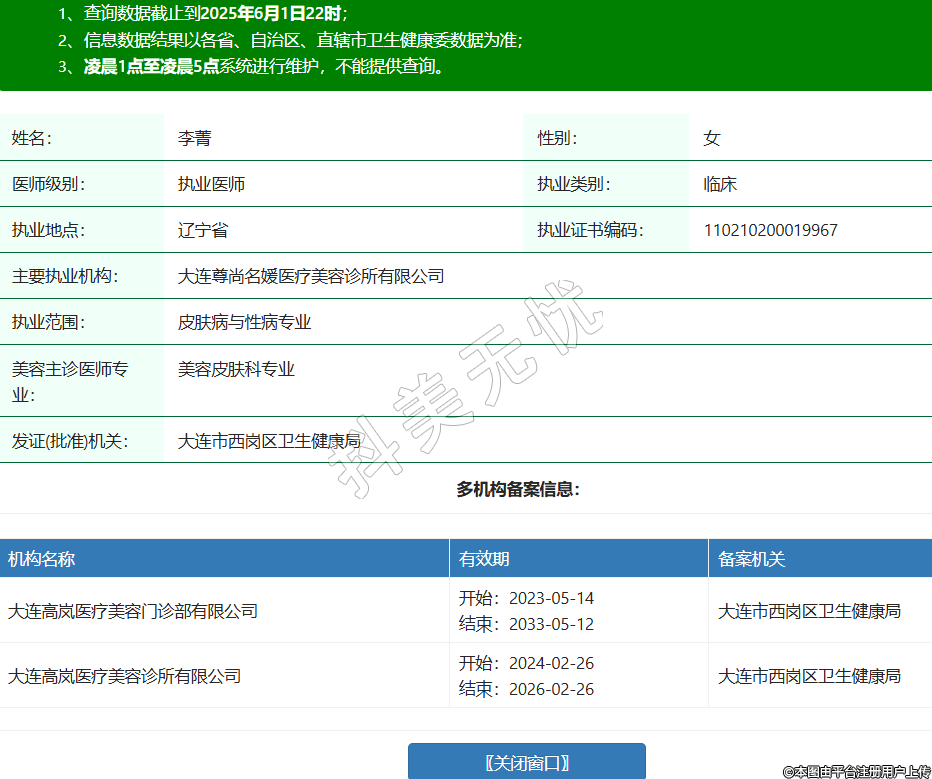 姓名:李菁性別:女醫(yī)師級(jí)別:執(zhí)業(yè)醫(yī)師執(zhí)業(yè)類別:臨床執(zhí)業(yè)地點(diǎn):遼寧省執(zhí)業(yè)證書編碼:110210200019967主要執(zhí)業(yè)機(jī)構(gòu):大連尊尚名媛醫(yī)療美容診所有限公司執(zhí)業(yè)范圍:皮膚病與性病專業(yè)美容主診醫(yī)師專業(yè):美容皮膚科專業(yè)發(fā)證(批準(zhǔn))機(jī)關(guān):大連市西崗區(qū)衛(wèi)生健康局多機(jī)構(gòu)備案信息:機(jī)構(gòu)名稱 有效期 備案機(jī)關(guān) 大連高嵐醫(yī)療美容門診部有限公司 開始:2023-05-14結(jié)束:2033-05-12大連市西崗區(qū)衛(wèi)生健康局 大連高嵐醫(yī)療美容診所有限公司 開始:2024-02-26結(jié)束:2026-02-26大連市西崗區(qū)衛(wèi)生健康局 -