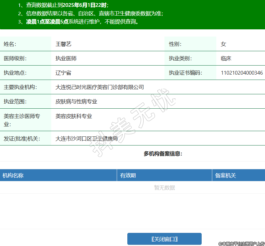 姓名:王馨藝性別:女醫(yī)師級(jí)別:執(zhí)業(yè)醫(yī)師執(zhí)業(yè)類別:臨床執(zhí)業(yè)地點(diǎn):遼寧省執(zhí)業(yè)證書編碼:110210204000346主要執(zhí)業(yè)機(jī)構(gòu):大連悅己時(shí)光醫(yī)療美容門診部有限公司執(zhí)業(yè)范圍:皮膚病與性病專業(yè)美容主診醫(yī)師專業(yè):美容皮膚科專業(yè)發(fā)證(批準(zhǔn))機(jī)關(guān):大連市沙河口區(qū)衛(wèi)生健康局 -