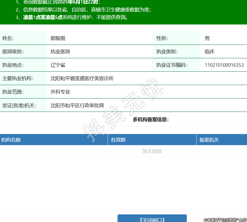 姓名:郎振圖性別:男醫(yī)師級(jí)別:執(zhí)業(yè)醫(yī)師執(zhí)業(yè)類(lèi)別:臨床執(zhí)業(yè)地點(diǎn):遼寧省執(zhí)業(yè)證書(shū)編碼:110210100016353主要執(zhí)業(yè)機(jī)構(gòu):沈陽(yáng)和平碧蓮盛醫(yī)療美容診所執(zhí)業(yè)范圍:外科專(zhuān)業(yè)發(fā)證(批準(zhǔn))機(jī)關(guān):沈陽(yáng)市和平區(qū)行政審批局 -
